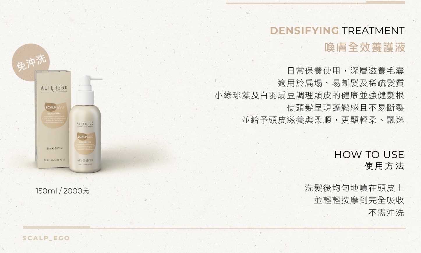 【使用】洗髮後均勻噴在頭皮上並輕輕按摩至完全吸收,不須沖洗。